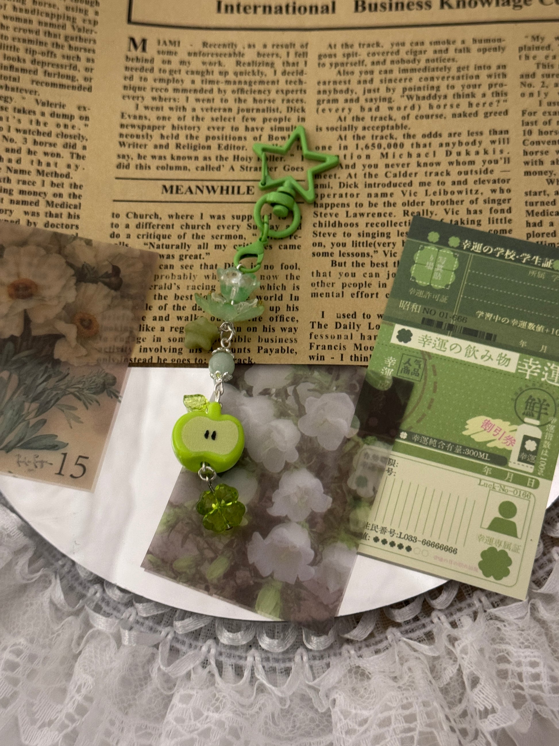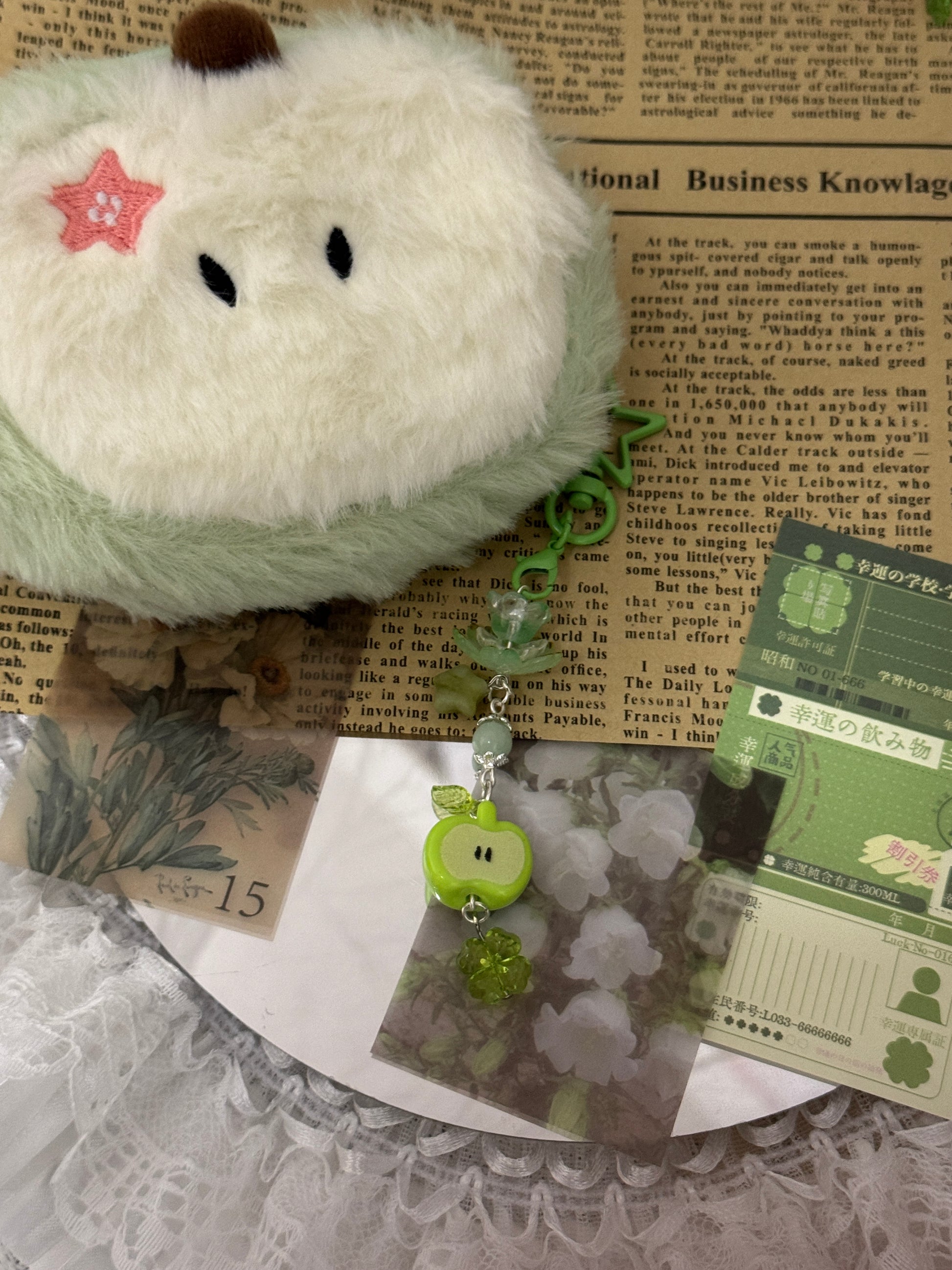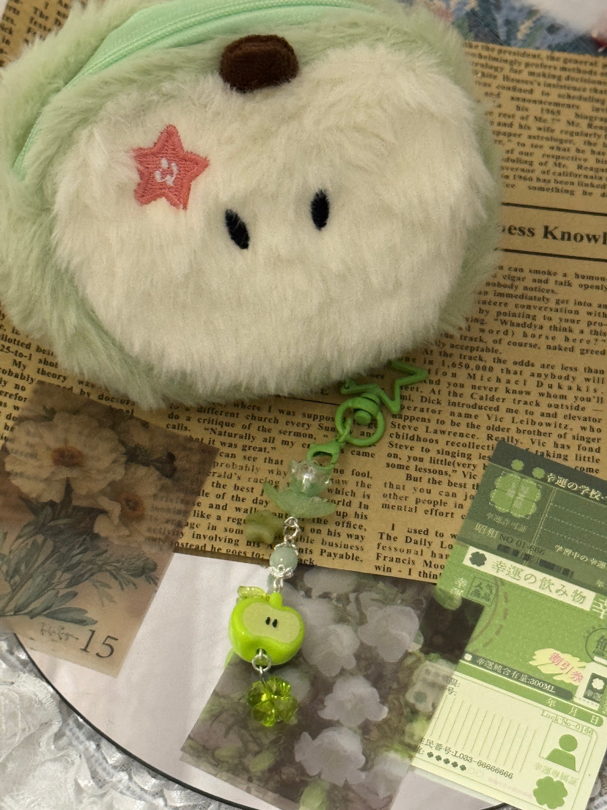 A sweet and playful keychain featuring a cute green apple charm, jade starΒ bead, and a clover bead. Its soft pastel green tones give it a fun, dreamy vibeβperfect for decorating your bag, phone, or keys with a touch of charm and freshness. β¨ππ
