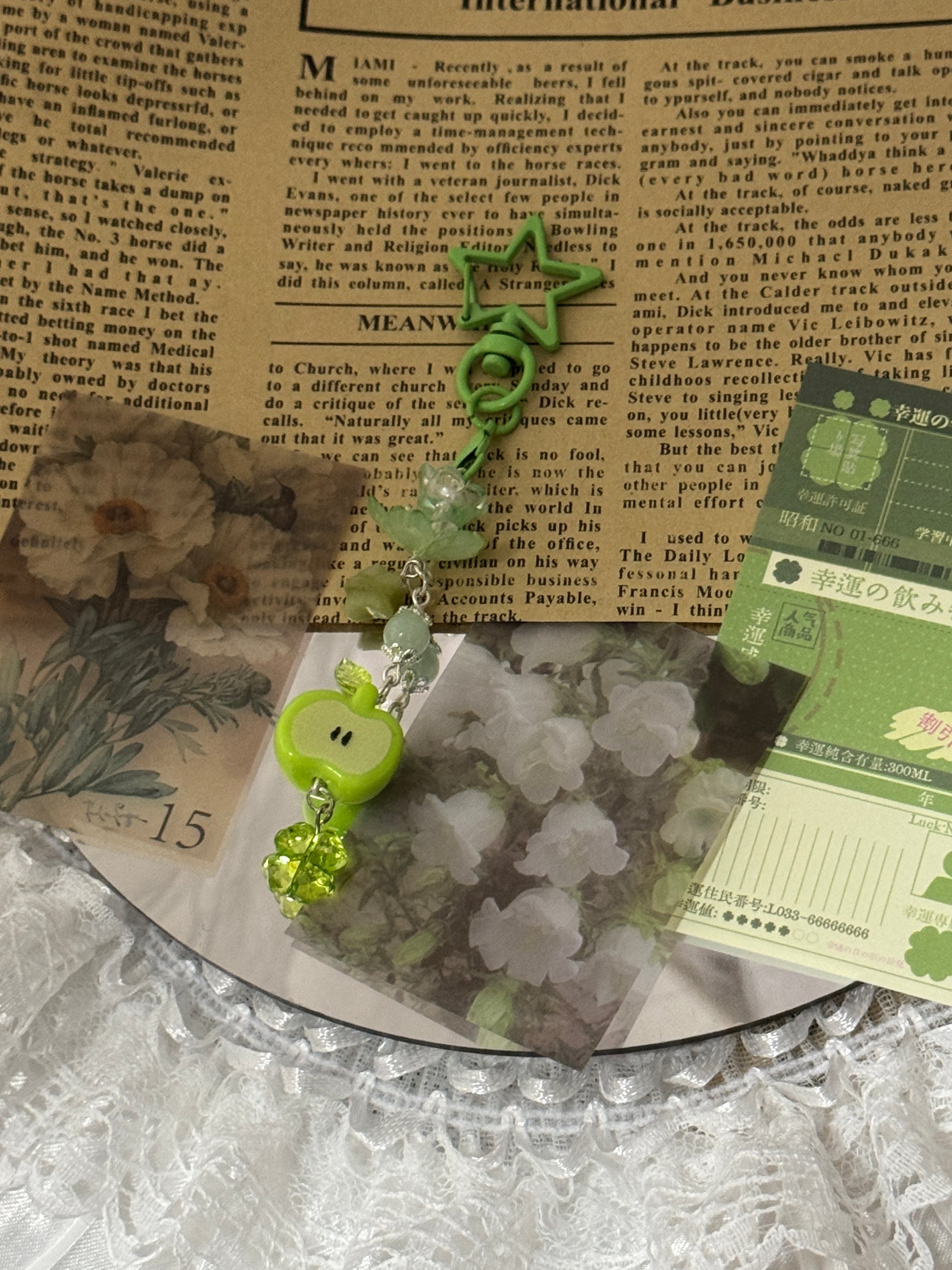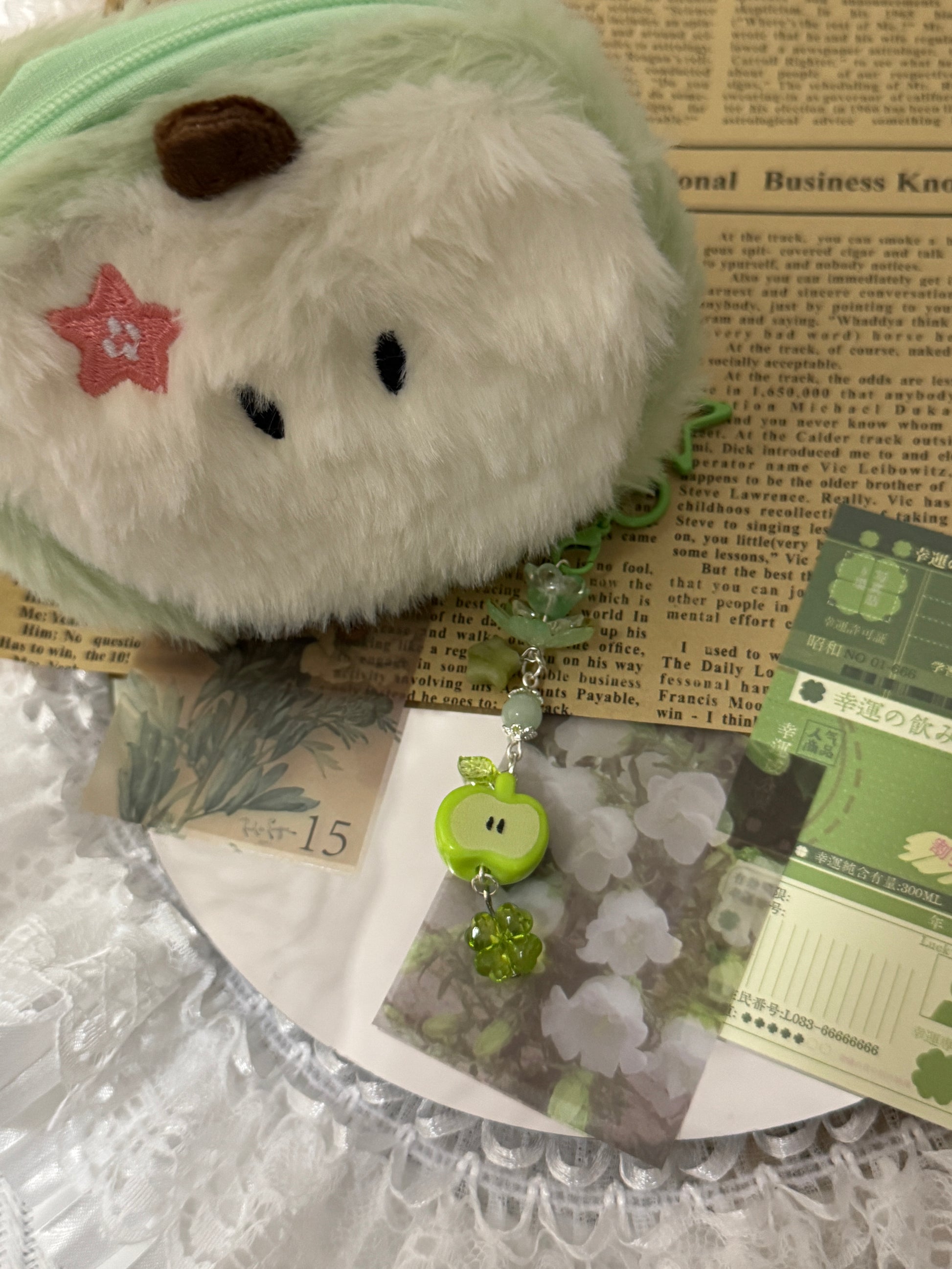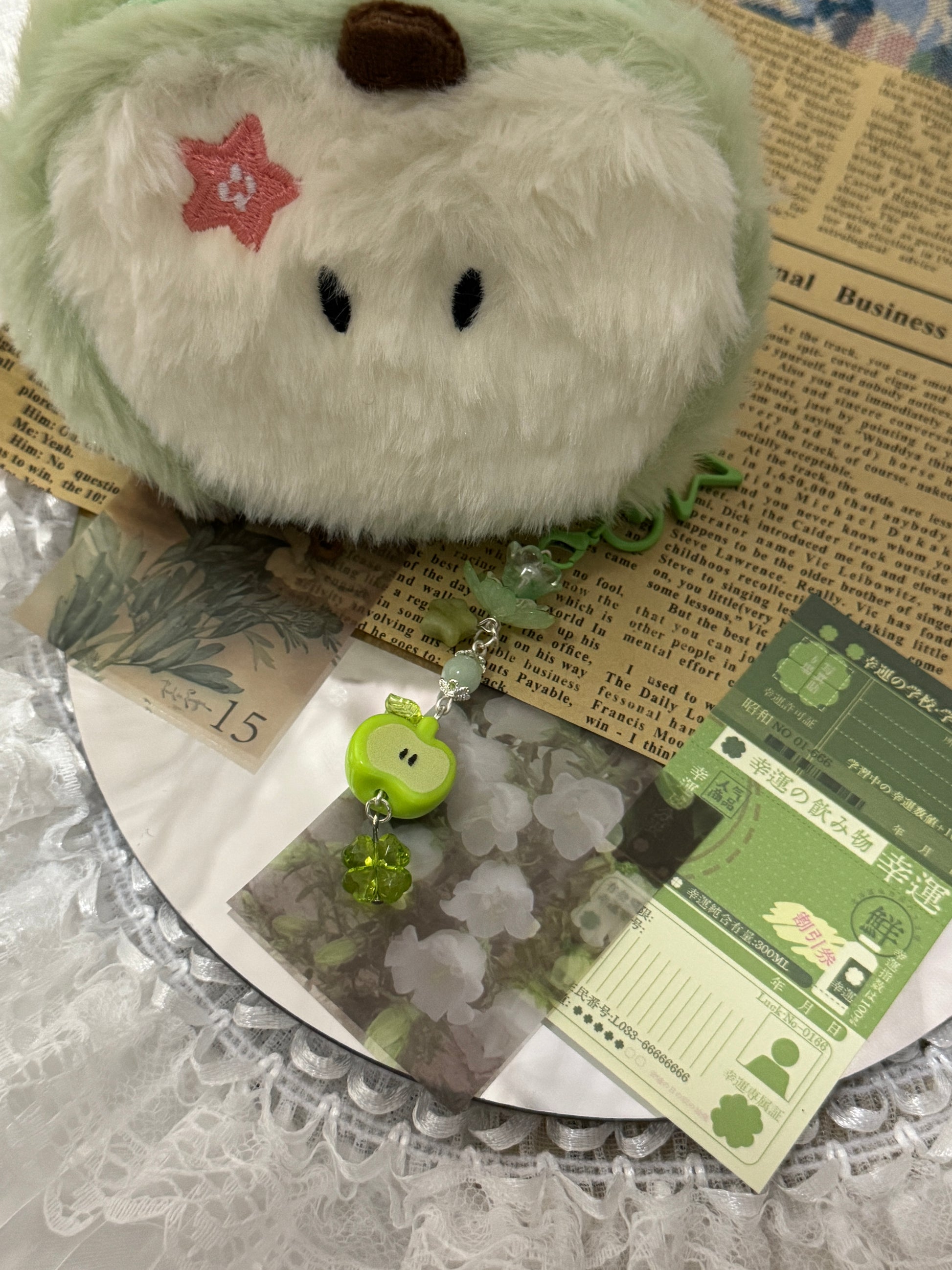 A sweet and playful keychain featuring a cute green apple charm, jade starΒ bead, and a clover bead. Its soft pastel green tones give it a fun, dreamy vibeβperfect for decorating your bag, phone, or keys with a touch of charm and freshness. β¨ππ